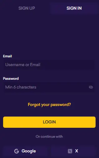 Authorisation on the platform is done via the Login button in the top right corner of the site. The procedure requires entering the email and password specified during registration. After successful login, the authorisation icon is replaced by a deposit button.